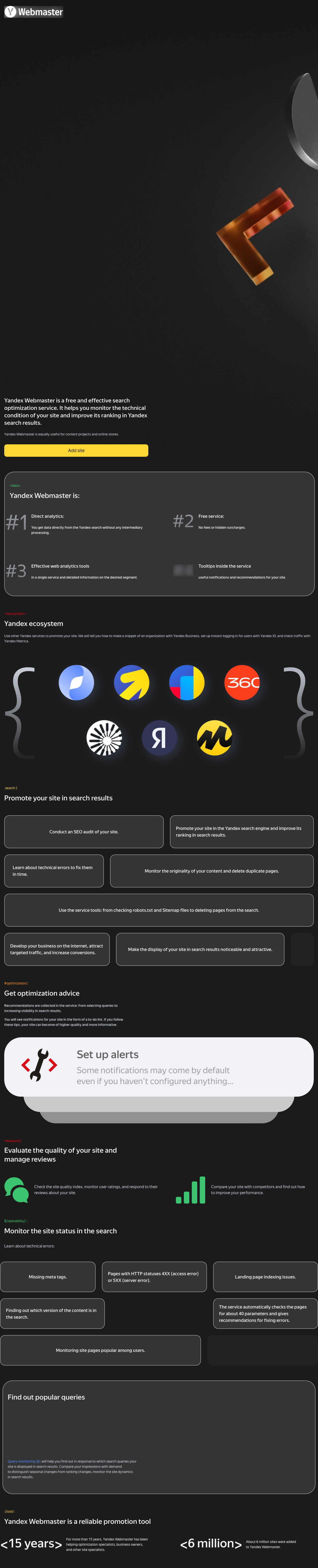 你会看到 Yandex Webmaster 的推广首页(深色背景,介绍功能要点)。点击页面中的**「Sign In」**按钮,或直接访问 passport.yandex.com 登录。